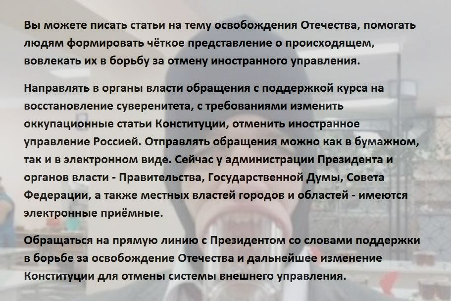 Раскрепощённым мужчинам и женщинам надо чётко демонстрировать свои твёрдые намерения освободить Отечество от американской оккупации и постоянно плющить коллаборационистов ещё копошащихся в органах власти.