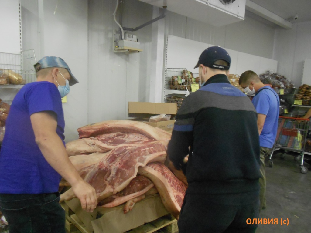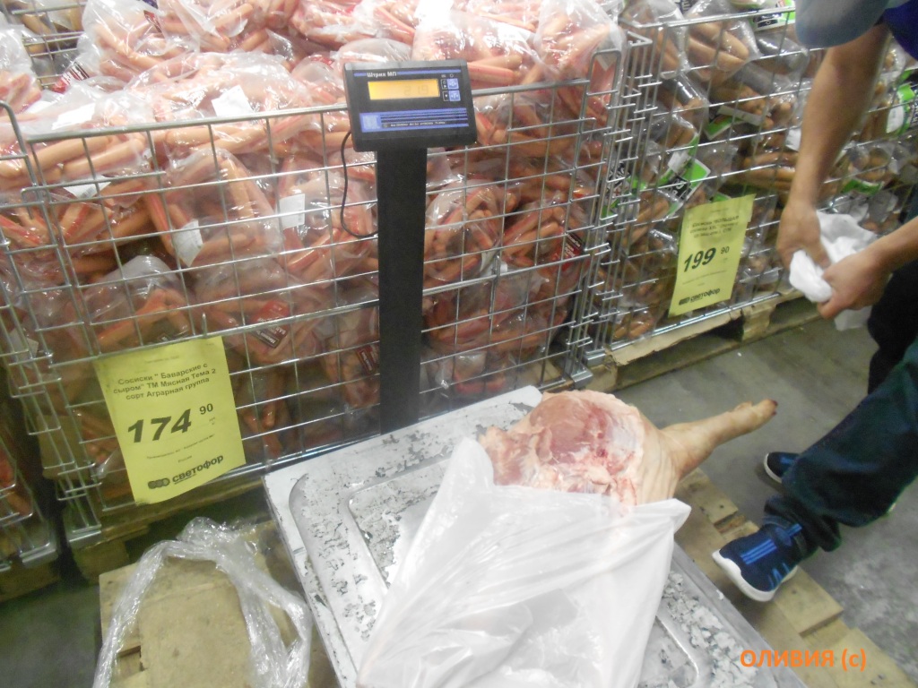 Как вы наверное знаете и видели: мясо «Светофор» хранит в отделе-холодильнике. Там оно лежит по половине туши, но, во всяком случае, у нас это так. В этот раз в магазине не работал безнал, и мне пришлось звать рабочего, чтобы он отрубил мне кусочек свинины поменьше, так как было мало налички.