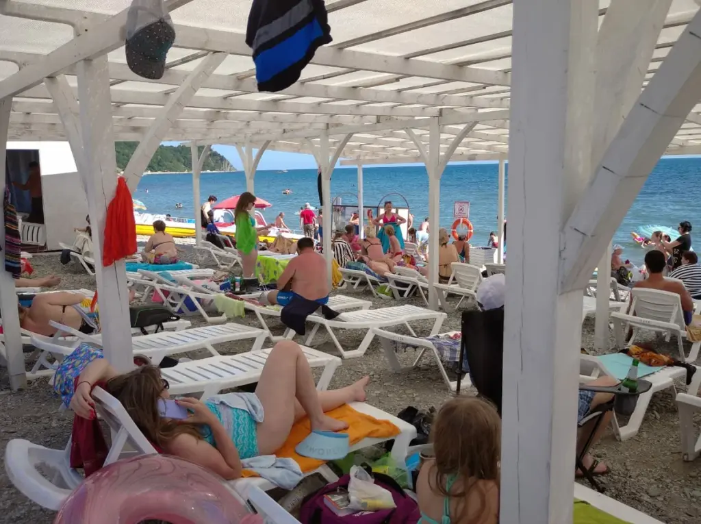 На пляже много отдыхающих и никто не соблюдает дистанцию в 1, 5 метра. Лежаки стоят на расстояние не больше 50-20 см. Пляж полностью забит и ни о какой дистанции речи не шло.