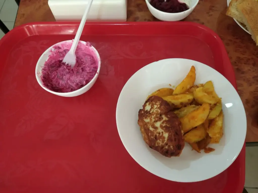 Наш обед на двоих обошелся нам в 433 рубля. В него входили: жаренная картошка, куриная котлета, свекольный салат и кизиловый компот-это мой заказ. А муж пожелал порцию макарон, куриную котлету, сосиску, свекольный салат и компот. Еда была вкусная, нам все понравилось.