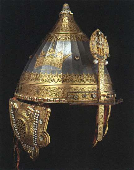 Здесь представлены: шлем – мисюрка, сабля, сделанная в Стамбуле, но не турками, а православными, которые жили в христианском районе Константинополя. Эту саблю они прислали в подарок Алексею Михайловичу. Оружие украшает чисто восточное сочетание красных и зелёных камней. В таком стиле украшены саадак, колчан и налуч.