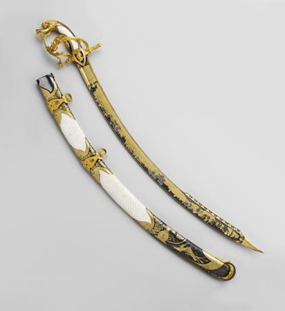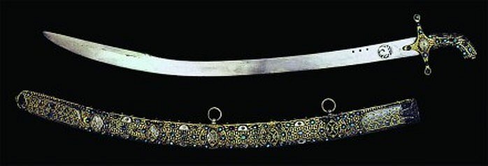 Сабля, инкрустированная слоновой костью, выполнена уральским оружейником Иваном Бушуевым из Златоуста в 1829 г. У этого мастера было личное клеймо, где изображен крылатый конь. Он сделал эту саблю в честь победы в русско-турецкой войне.