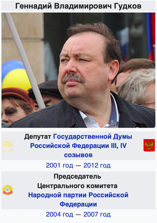 Генна́дий Влади́мирович Гудко́в (род. 15 августа 1956, Коломна, Московская область) — российский государственный деятель, предприниматель, политик, оппозиционер, полковник ФСБ России в отставке. (из Вики)