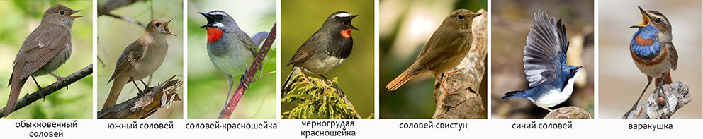 В России 7 видов соловьев: обыкновенный соловей, южный соловей, соловей-красношейка, черногрудая красношейка, соловей-свистун, синий соловей, варакушка.
