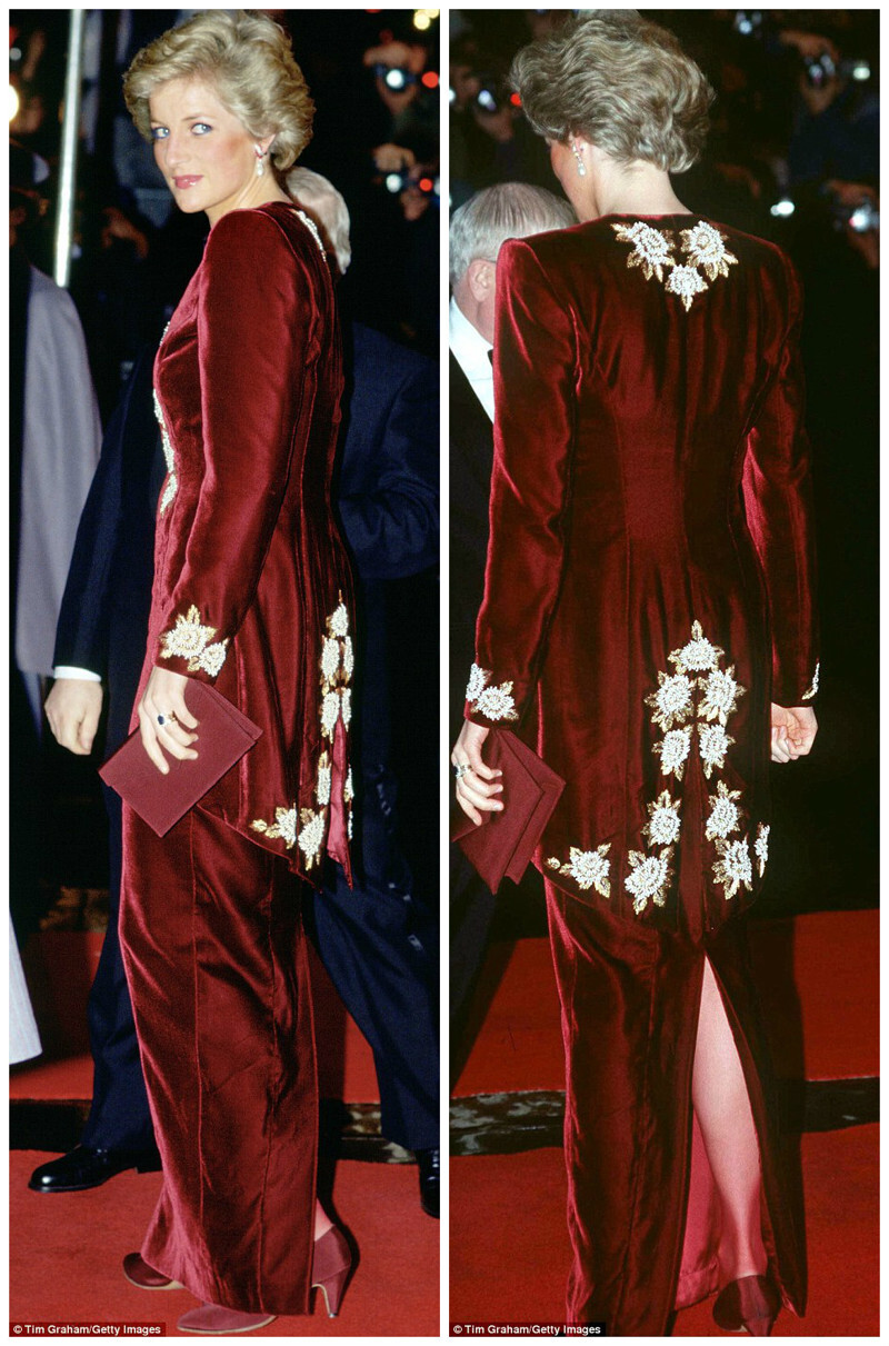 Это красное бархатное платье впервые было на ней на премьере фильма "Стальные магнолии" в 1990 году, а затем публика вновь увидела его в 1992 году во время официального визита в Южную Корею. Фасон платья довольно интересный, и вышивка бросается в глаза, поэтому аксессуары (туфли и маленький клатч) Диана предпочла того же цвета, чтобы не отвлекали на себя внимание от основного. Можно сказать, что это еще одно платье, сделанное специально "под камеры", и сделанное очень искусно.