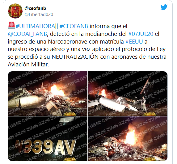 Стратегическое оперативное командование Венесуэлы информирует, что венесуэльскими военными "нейтрализован" самолет торговцев наркотиками с американским регистрационным номером. Этот летательный аппарат был сбит после того как нарушил воздушное пространство Боливарианской республики.