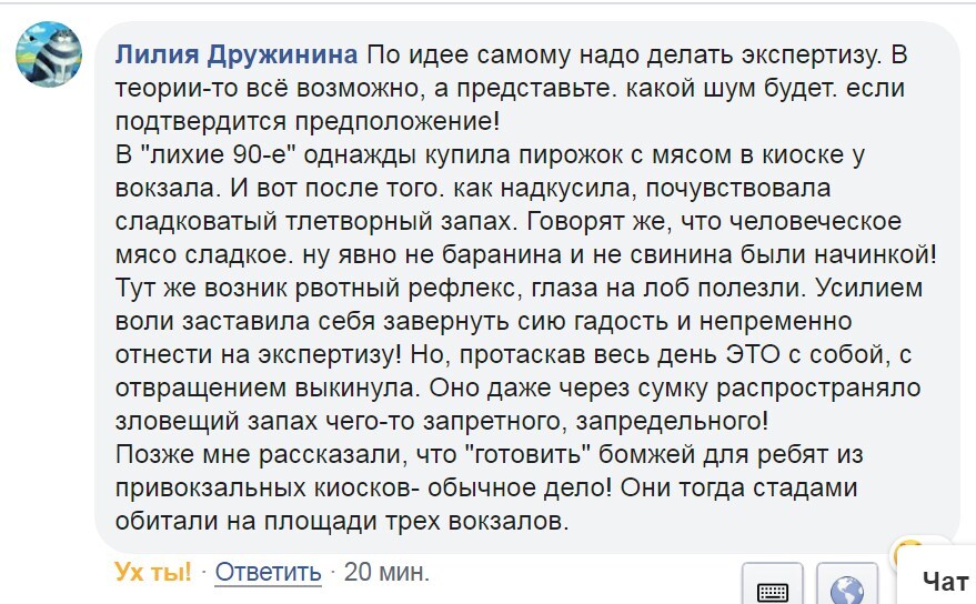 В "лихие 90-е" однажды купила пирожок с мясом в киоске у вокзала. И вот после того. Как надкусила, почувствовала сладковатый тлетворный запах. Говорят же, что человеческое мясо сладкое. Ну явно не баранина и не свинина были начинкой! Тут же возник рвотный рефлекс, глаза на лоб полезли. Усилием воли заставила себя завернуть сию гадость и непременно отнести на экспертизу! Но, протаскав весь день ЭТО с собой, с отвращением выкинула. Оно даже через сумку распространяло зловещий запах чего-то запретного, запредельного!