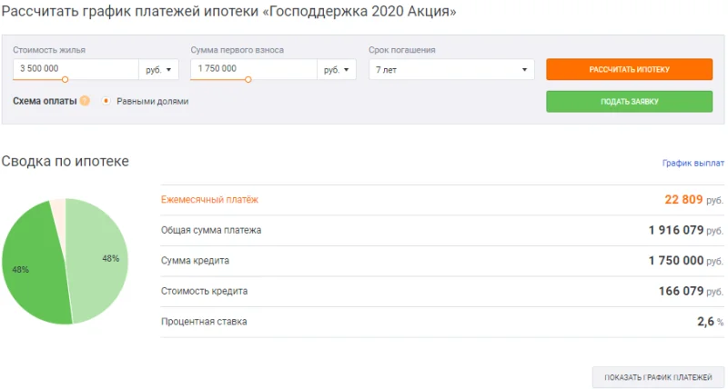 Возьмём квартиру в новостройке за 3 500 000 рублей и первоначальным взносом 1 750 000 рублей. По кредиту на 7 лет ставка – 9,2%, ежемесячный платёж – 28 334 рубля. Это при учёте страхования жизни.