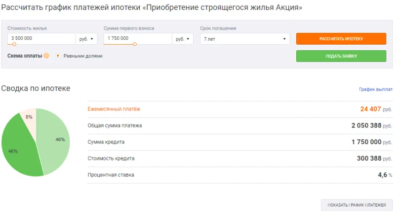 Расчёт ипотеки Сбербанка с в новостройке на калькуляторе «Выберу. Ру».