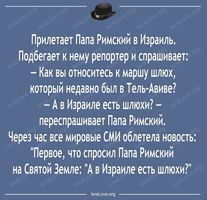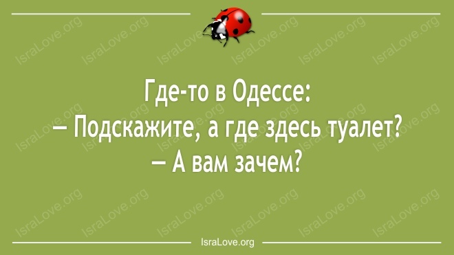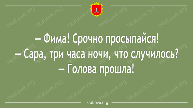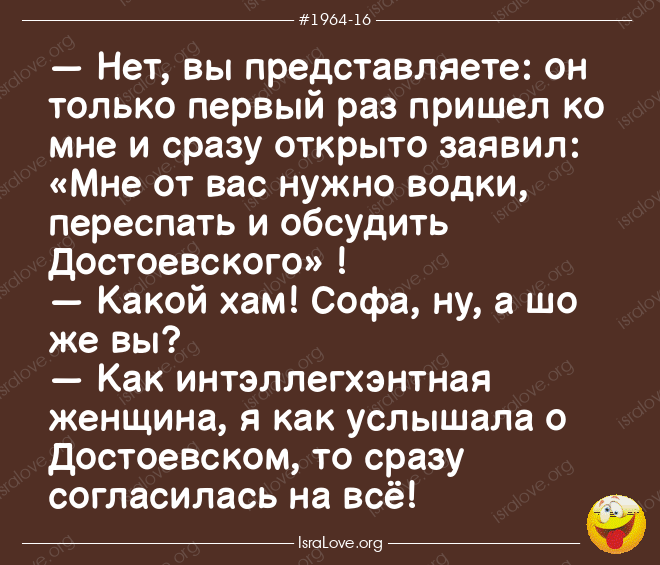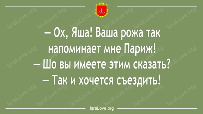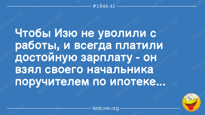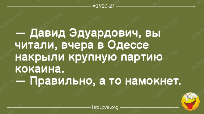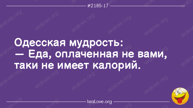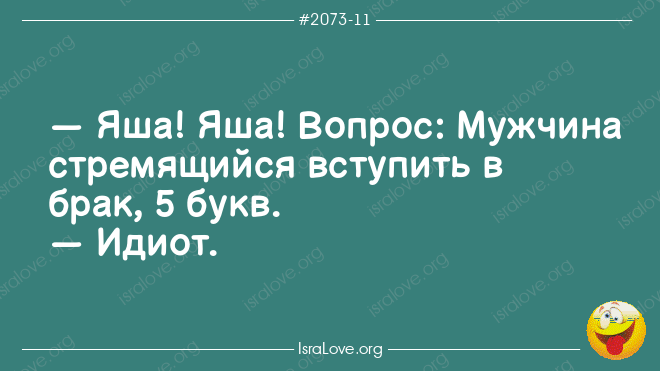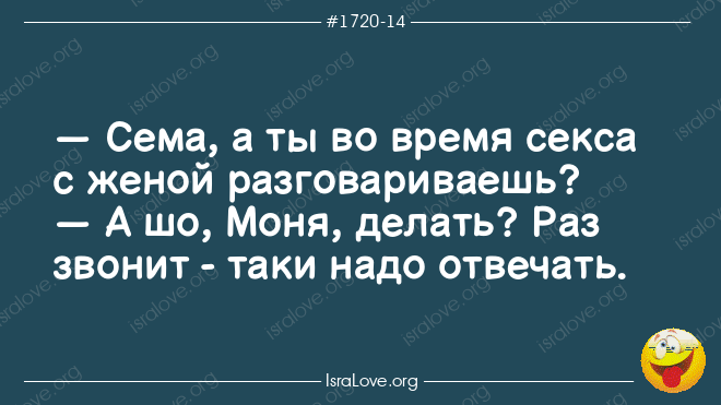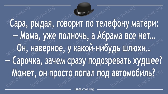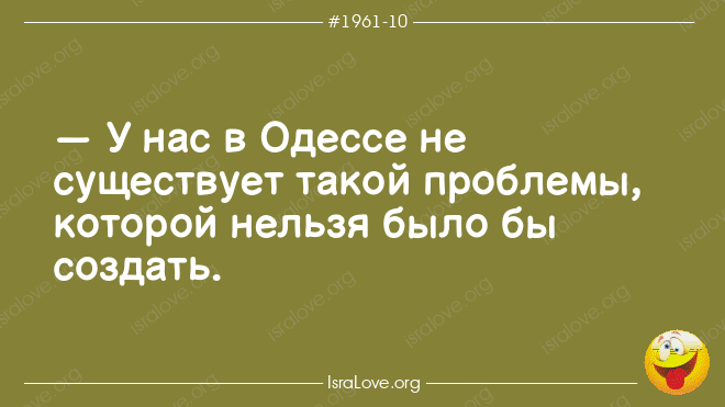 Одесский суд: — Циля Моисеевна, шо имеете сказать за причины развода? Муж мало зарабатывает? По дому не помогает? Может, с детьми не занимается? Или, стесняюсь спросить, не удовлетворяет Вас как женщину? — Ой, шо Ви, Ваша честь! Все это Изя делает! Но Ви бы видели, с каким лицом!