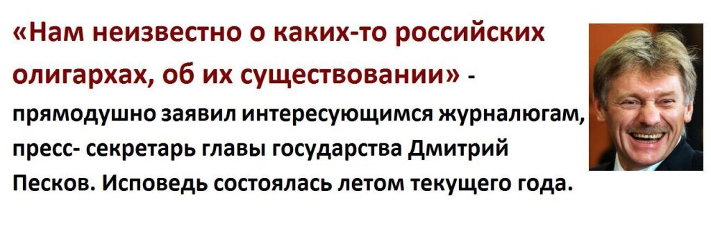 Кремль неоднократно и очень честно заявлял, что олигархов, людей, которые используют близость к власти, чтобы получить высокую прибыль, или которые, пользуясь своей состоятельностью, пытаются влиять на политические решения в стране, просто НЕ СУЩЕСТВУЕТ!