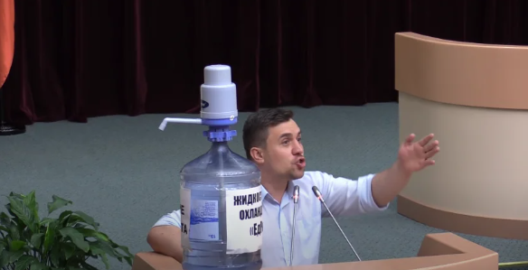 Николай Николаевич, вам там легко? А потом вдруг промахнетесь и упадете с лестницы? (Об этом он сказал в тот момент, когда Николай шел с трибуны с бутылкой воды. Он также является депутатом, который как можно быстрее оттолкнул Николая Бондаренко от лестницы. Вы можете посмотреть видео на канале YouTube).