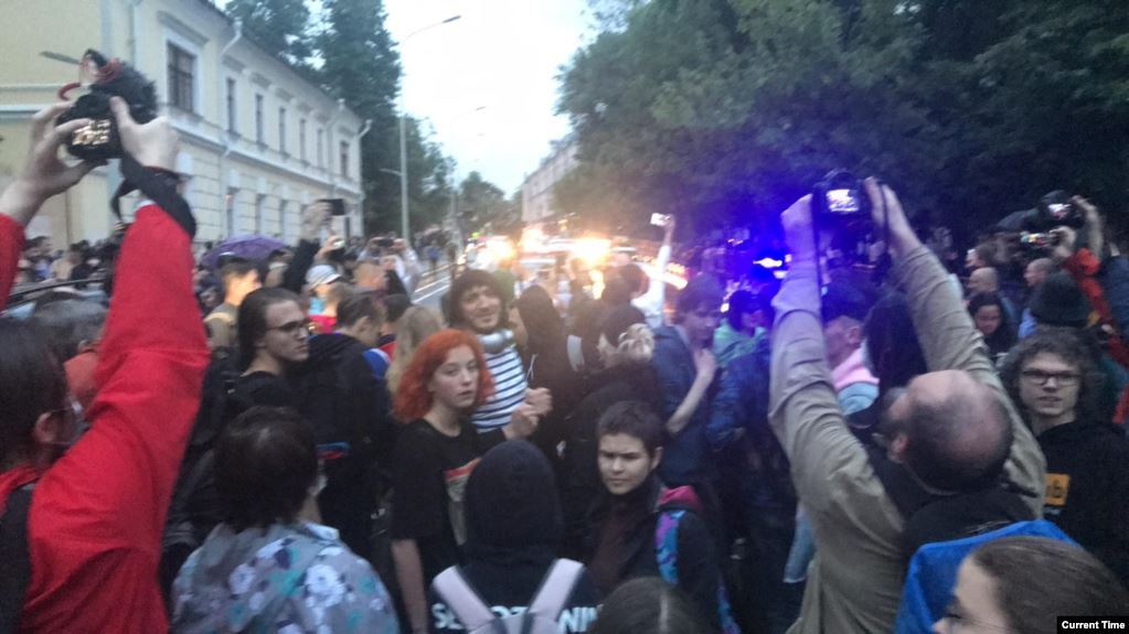 Одновременно с акцией на Пушкинской площади в Москве схожая акция проходила в центре Санкт-Петербурга. О задержаниях там пока не сообщалось.