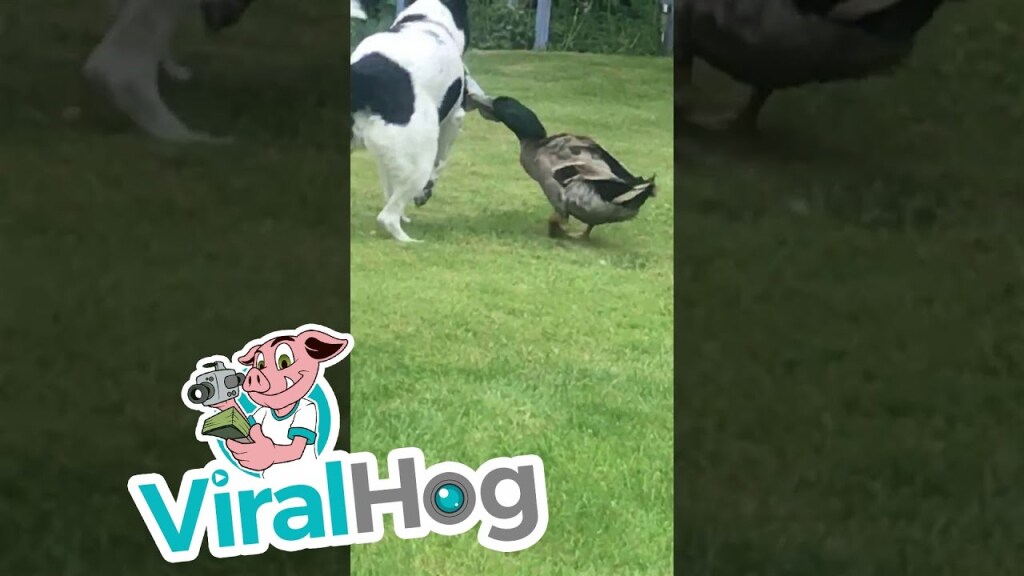 Собака и утка играют в перетягивание каната