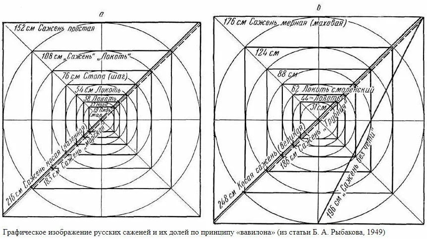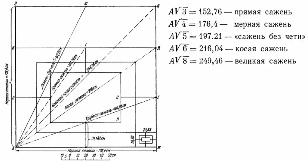 Величины этих мер - это последовательность, образованная системой вписанных квадратов и каждое последующее число возрастает на корень из двух. Это отношение легло в основу системы согласования частей славянской архитектуры. Далее, эту тему подробно раскрывает историк и архитектор Алексей Алексеевич Тиц в издании 1978 г. "Загадки древнерусского чертежа".