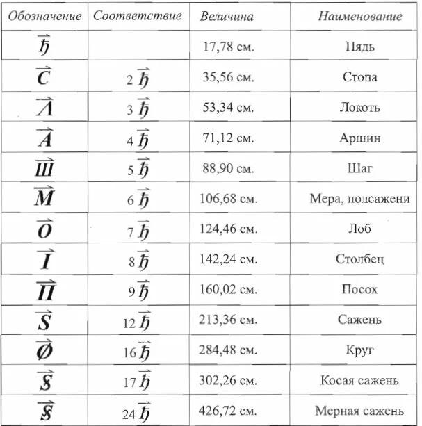 Как Вы можете увидеть, каждая мера - это кратное значение от Пяди.