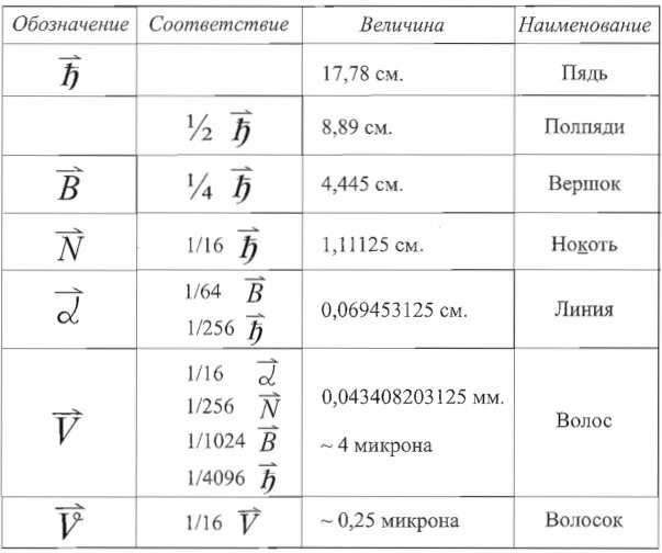 Итак, Пядь равна 17,78 см. Пядевая система делится на малые, средние и большие меры. Каждая мера носит своё обозначение, которое вы увидите в табличке в первой колонке.