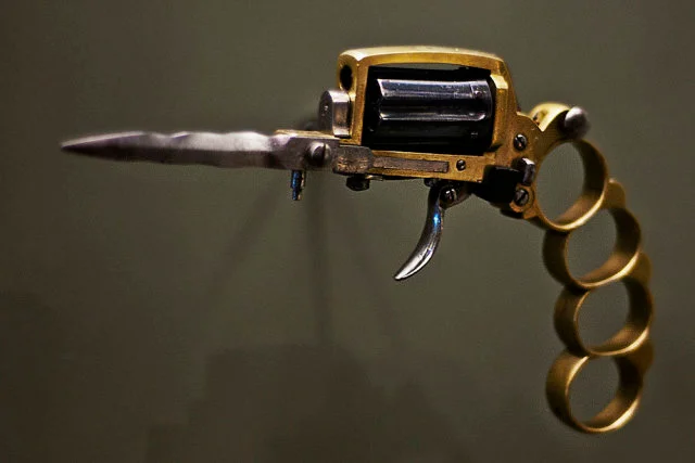Вторым в списке идет комбинированный револьвер "Апаш", изготовленный в 1869 году по патенту бельгийца Луи Дольна. В сложенном виде он представлял собой кастет, но пользоваться им было неудобно. Внутри находился еще и раскладной нож длиной 89 мм, который держался на ненадежном шарнире. Револьвер был без ствола: "перечница" позволяла стрелять на 5 метров максимум, а пуля калибра 7 мм могла только напугать. Вероятность осечки была очень высокой из-за конструктивных особенностей. Несколько тысяч выпущенных револьверов пошли, в основном, по частным коллекциям из-за необычного вида.