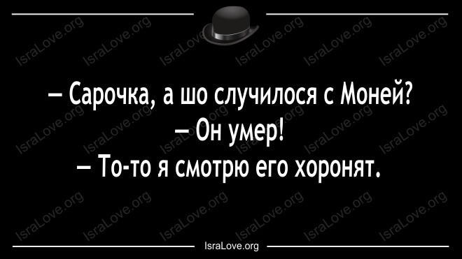Ложатся спать Моня и Циля. — Ой, Моня, мне так плохо, так плохо! — А кому сейчас легко, спи Циля! — Моня, но мне очень плохо! — Спи, Циля, кому сейчас хорошо! Утром просыпается, а Циля уже холодная — Ой, Циля, что же ты не сказала, что тебе хуже всех!