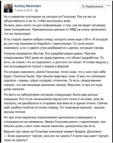 И тут же фактически "валит" своего бывшего друга и соратника скрин-шотом в защиту полиции и, как-бы, подтверждающим справедливость обвинений Голунова в незаконном обороте наркотиков: