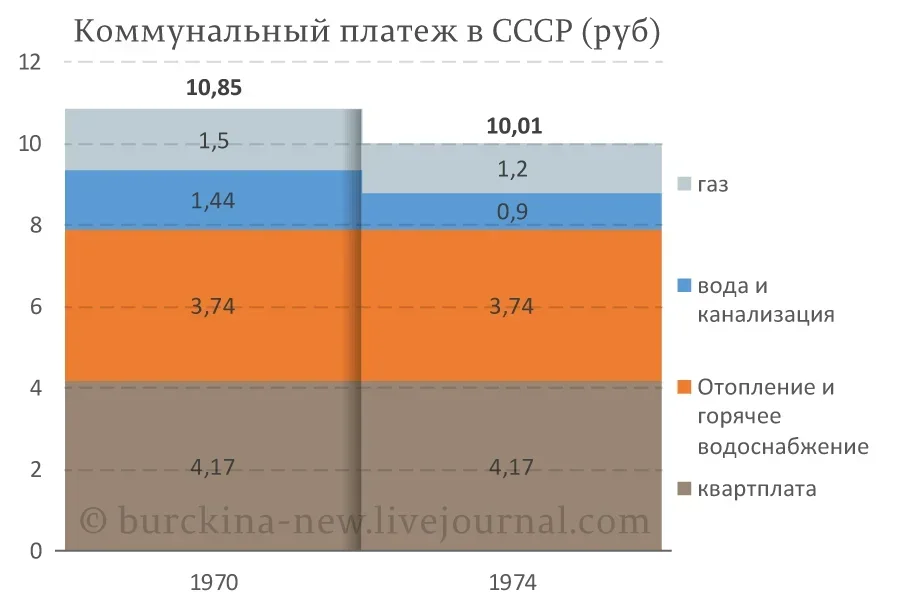 В свете этого весьма полезно будет узнать размер коммунальных платежей времен т.н. застоя или периода правления Леонида Ильича Брежнева и "проклятых" коммунистов, раздававших бесплатные квартиры в количестве 1,2-1,3 миллиона в год:
