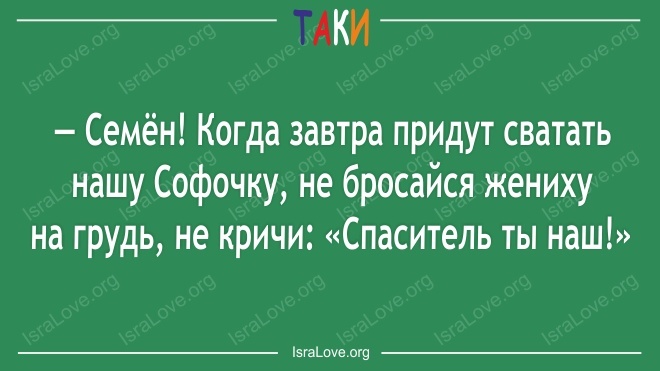 • Моня понял, что хочет жениться на Соне, когда та продала подаренный им букет. — Ну, хорошо, Фима, первое время у меня поживешь, а утром домой поедешь. •
