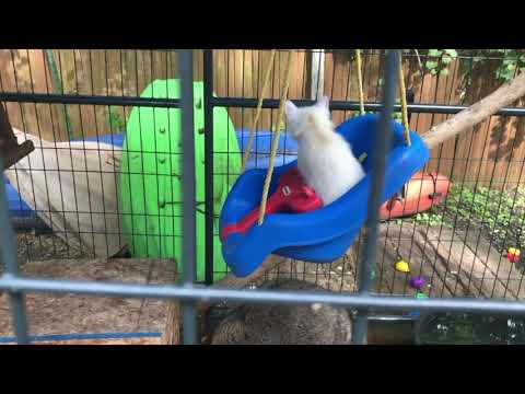 Occurred on July 20, 2020 / Hudson, Indiana, USA "BushBaby the Raccoon and his sister Pearl the Albino Raccoon playing outside on their swing. They are both ...