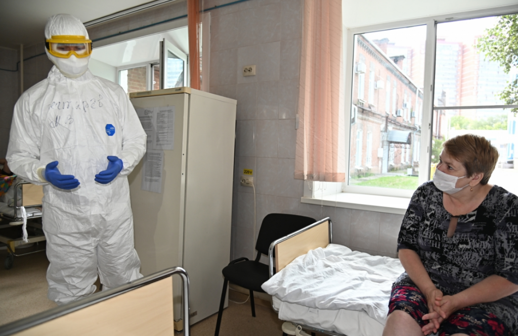Врио губернатора (слева в защитном скафандре) пообщался с местными больными. Чтобы не "подхватить хабаровский вирус" ему пришлось серьезно облачиться