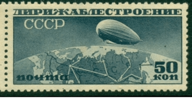 Данная марка тиражировалась в честь дирижаблестроения Советского Союза. Эскиз представляет собой большой дирижабль, который поднимается в космос над всей планетой как знамение того, что СССР занимала большую часть земного шара. Изначально вся партия должна была напечататься в коричневых тонах, однако по причине неизвестной ошибки 3000 марок были выпущены в аспидно-синем цвете, за что получили в народе название «Аспидки». Лишь 24 марки, которые были напечатаны в перфорации без зубцов, сегодня оцениваются в $40 250.