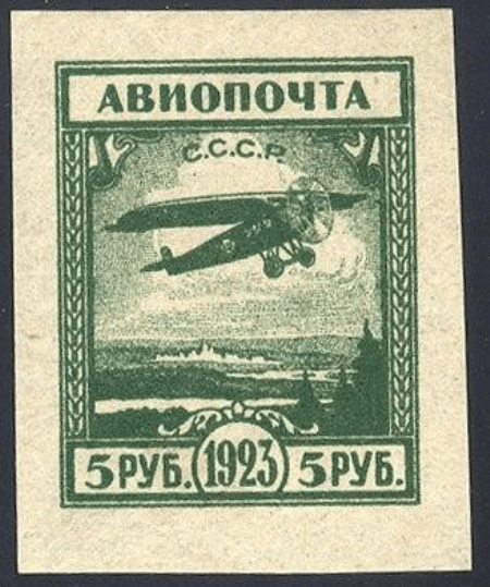 Авиапочтовые марки были выпущены в 1923 г. ограниченным тиражом номиналом 1, 3, 5 и 10 рублей. Самым выдающимся в серии оказался экземпляр номиналом 5 рублей, потому что первый лист в партии был напечатан с нестандартной крупной пятеркой.