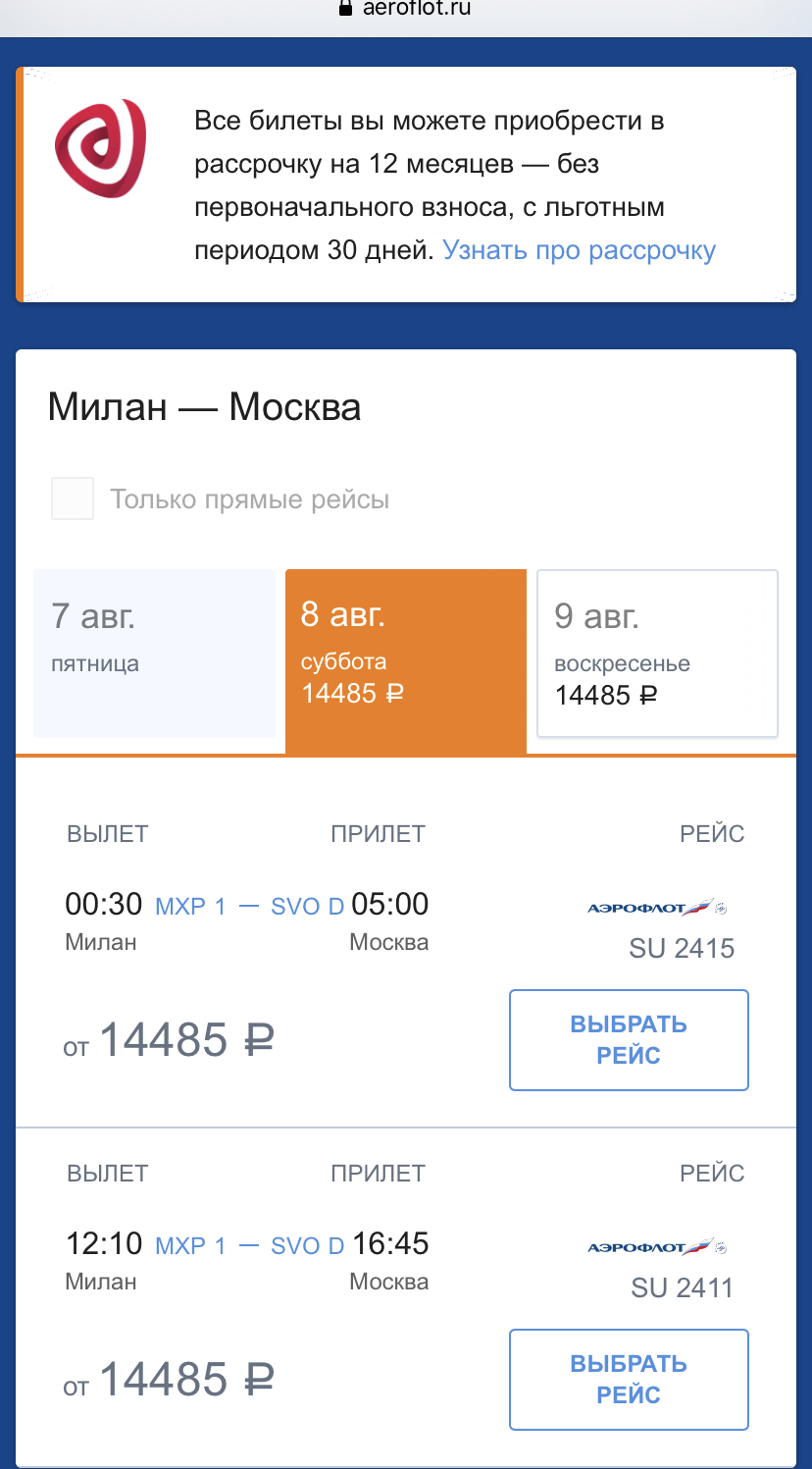 В 15:00 по Москве на сайте Аэрофлота ещё можно было забукировать билеты в Европу и обратно, что мы и попытались сделать ради эксперимента. К счастью, оплата не прошла, а через пять минут расписание передвинулось на 8 августа.