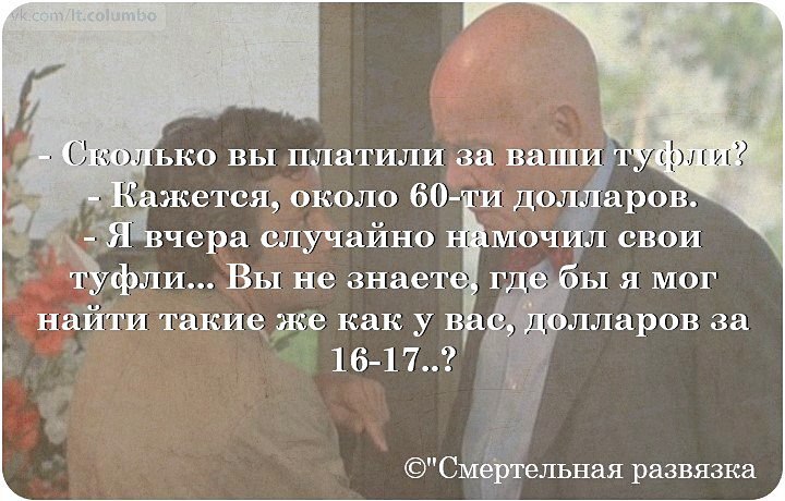 И еще чем интересен это фильм на мой взгляд. Коломбо, простой инспектор, такой неуклюжий, в помятом плаще, на супер старом авто, как здесь писал автор, курящий дешевые сигареты, абсолютно, извините, не парится на счет всего этого! Он выглядит человеком абсолютно счастливым при всем при этом! И очень органично существует в этот мире без всяких этих новомодных и дорогих примочек. Он интеллектуал! И его, как папуаса, не прельщают блестяшки, бусы и т.д. Или часы за 37 млн. рублей. Он профи в своем любимом деле - вот что его делает счастливым! И еще обратил внимание, что он, разоблачив преступника, немного жалеет даже его...
