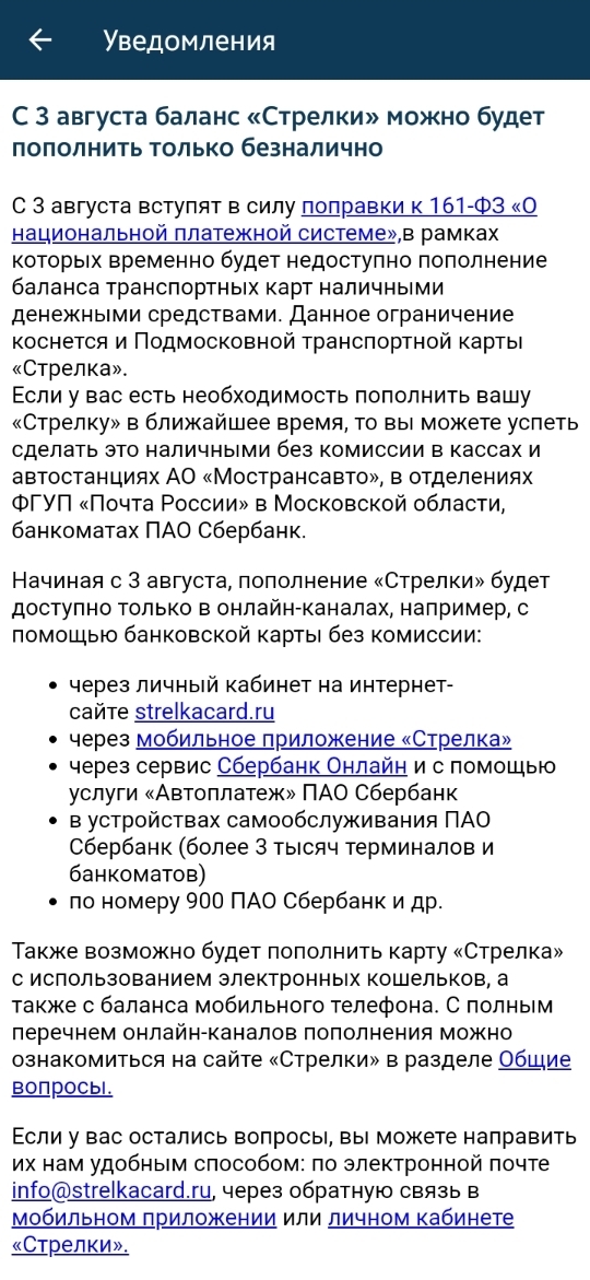 Вчера пришло всплывающее уведомление от приложения транспортной карты "стрелка" (по московской области) о том, что с 3 августа ВРЕМЕННО не будет возможности пополнять баланс карты наличными.