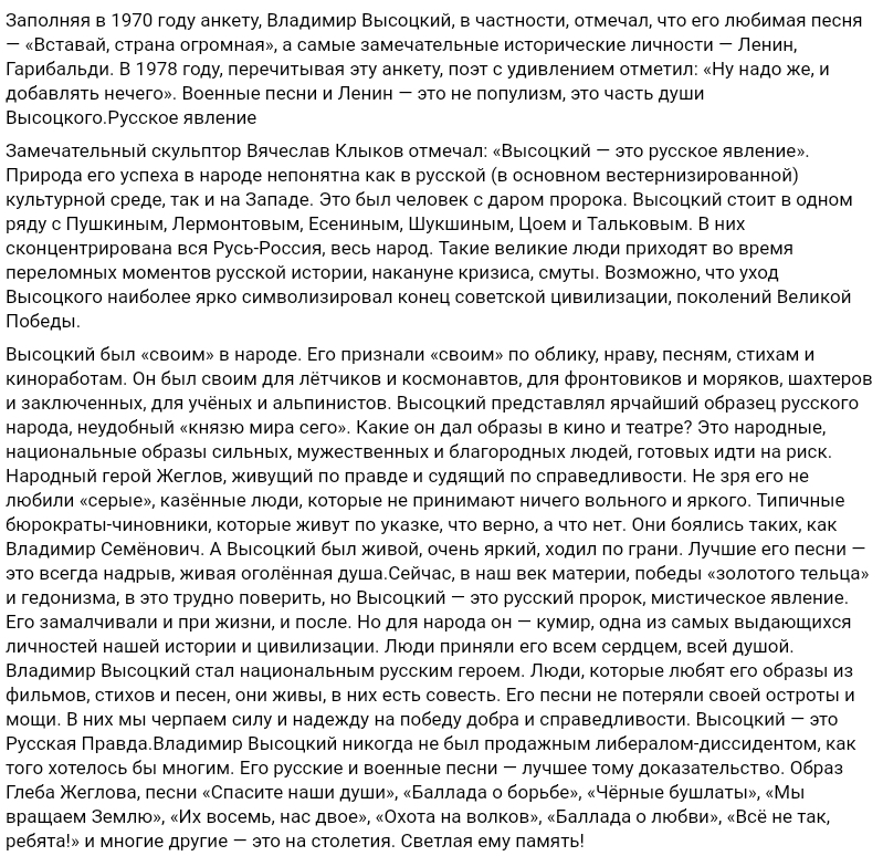 Если бы Владимир Семёнович дожил до страшных перестроечных лет, то вся прозападная нечисть, «мастера культуры», предавшие Россию за зарубежные премии и поездки, стали бы его врагами. Он любил Россию с надрывом и болью, что его и убило. Как отмечал хорошо знавший барда Николай Губенко, лучшие образцы поэзии Высоцкого — «это сгустки крови и боли за происходящее с народом». Уже умирая, он давал по два-три концерта в день, сжигая себя. Я не люблю