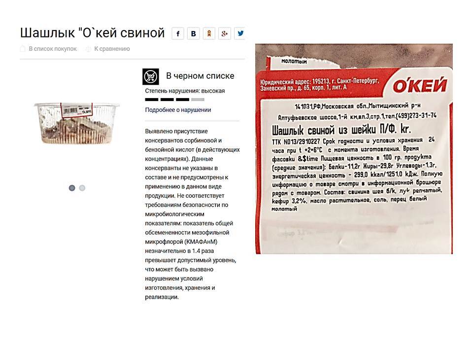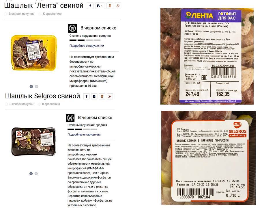 В самом начале июля специалисты Роскачества протестировали готовый шашлык, который продавался в супермаркетах «Лента», «Магнолия», «МясновЪ», «О`кей», «Перекресток», Globus, Selgros. Результаты тестов поразили даже самое смелое воображение: все шашлыки собственного производства из мяса свинины в маринаде попали в «чёрный список» Росконтроля.