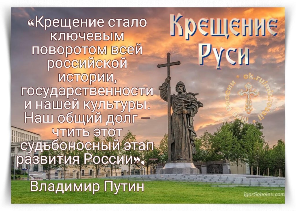 "...Очевидно, что Крещение стало ключевым поворотом всей российской истории, государственности и нашей культуры. Наш общий долг – чтить этот судьбоносный этап развития России..."