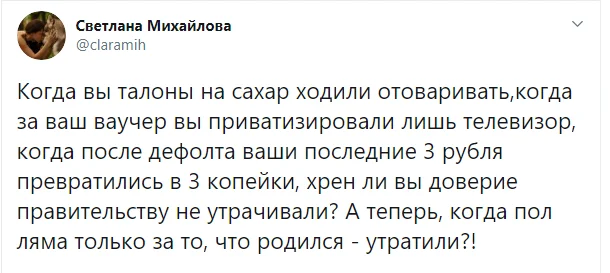 Я думаю, что взрослые митингующие об утрате доверия к президенту, скорее всего в 90-е не хлебнули горя. Были, как говорится у кормушки: ели сытно, спали в тепле. Или наслушались либералов. А кто-то тупо отрабатывает свои денежки. Стыдно господа/товарищи!
