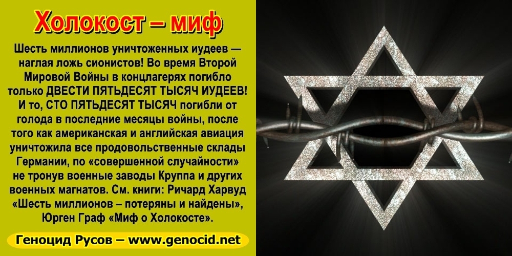 А вы знаете как меняли в Освенциме памятную плиту с количеством погибших? А по архивам там всего погибло 38 тысяч, это без разделения по национальностям! Кстати жиды в концлагерях часто были капо!