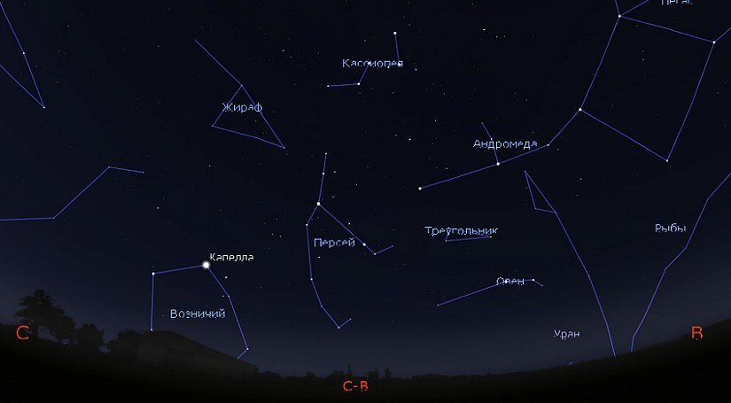 В августе проходит так называемый звездопад Персеиды. В пиковые дни (обычно это 9-13 августа) число сгораемых частиц может достигать до 200 штук в час. Для того, чтобы его увидеть необходимо смотреть в сторону созвездия Персея. Ниже на картинке показываем как отличить его на звездном небе. Жителям России повезло, ведь его видно только в северном полушарии.