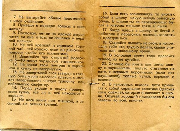 А начиналось всё благостно — как рекомендации: «Если есть возможность, то уноси с собой в школу какую-нибудь запасную обувь. В школе ты ее переоденешь: будет в классах меньше грязи и пыли». Или вот: «В некоторых школах дети приносят с собой серенькие халатики (детская спецодежда), которые и надевают в школе. Обычай хороший и следовало бы его завести во всех школах». Обычай, может и хороший, но гораздо лучше, что советская школьная форма стала развиваться всё-таки не по принципу кошмара «сереньких халатиков», а по принципу милитари-стиля для мальчиков — гимнастёрка и фуражка и возрождения имперского стиля для девочек — платья с фартуком.