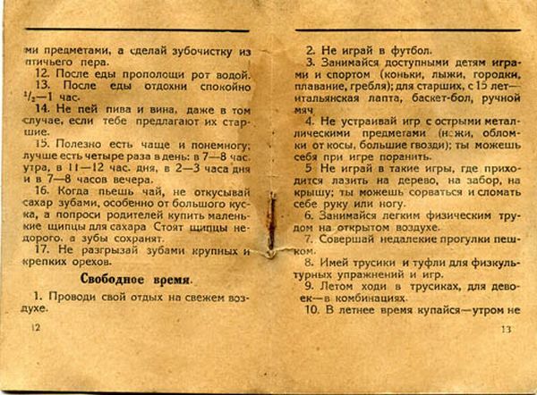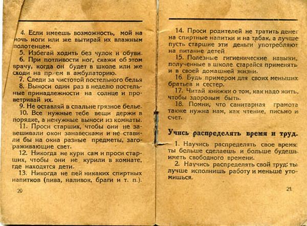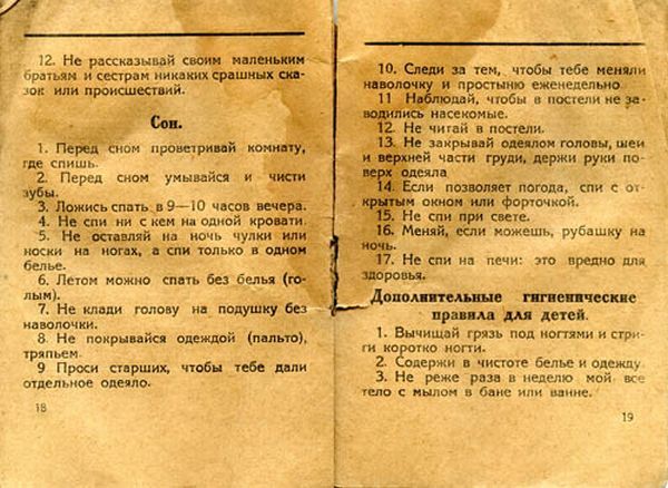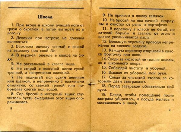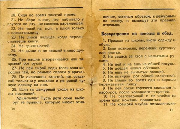 Часть из них представляются дикими по той только причине, что говорят об очевидных вещах — о тех, к которым мы привыкли и делаем уже на автомате. Но 90 лет назад — смешной по историческим меркам срок — это приходилось вдалбливать сызмала. И с превеликими трудами. Вот лишь несколько правил, несоблюдение которых запросто может превратить человека в животное: