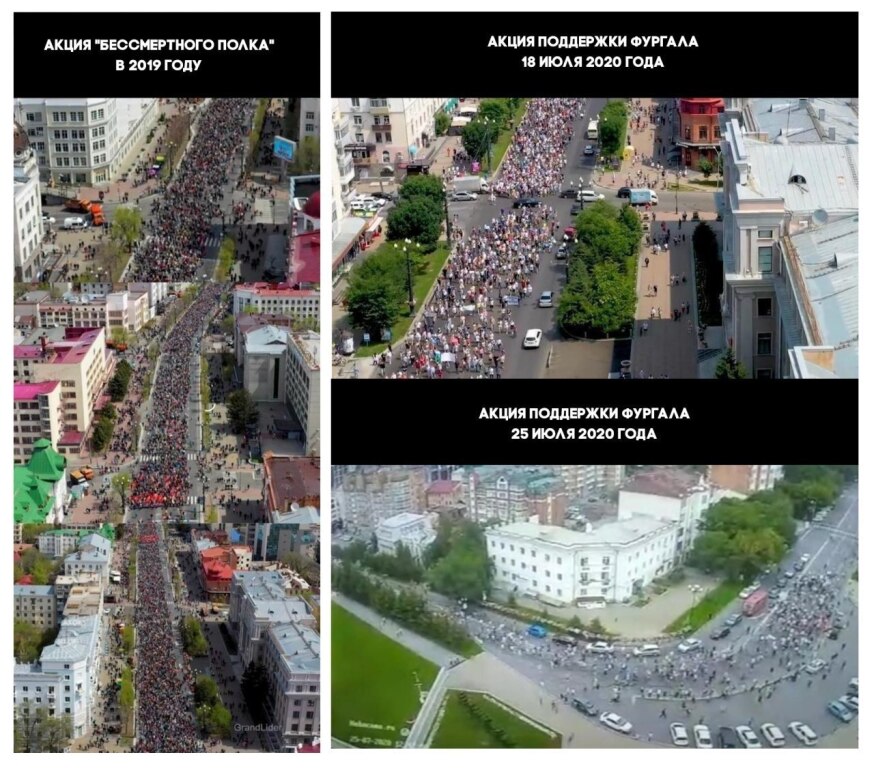 Так же некоторые утверждали, что на митинг вышло около 100 тысяч человек! Вот вам фото шествия "Бесмертного полка" прошлого года, участников было около 32 тысяч и фото митингов за фургала. Где здесь 100 тысяч? Фото шествия дается с увеличением, чтобы показать плотность потока.
