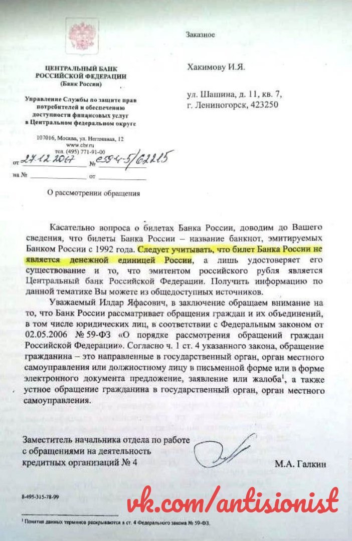 Это куда интереснее. "Следует учитывать, что Билет Банка России не является денежной единицей России, а лишь удостоверяет его существование..." Цитата из ответа ЦБ на запрос человека.