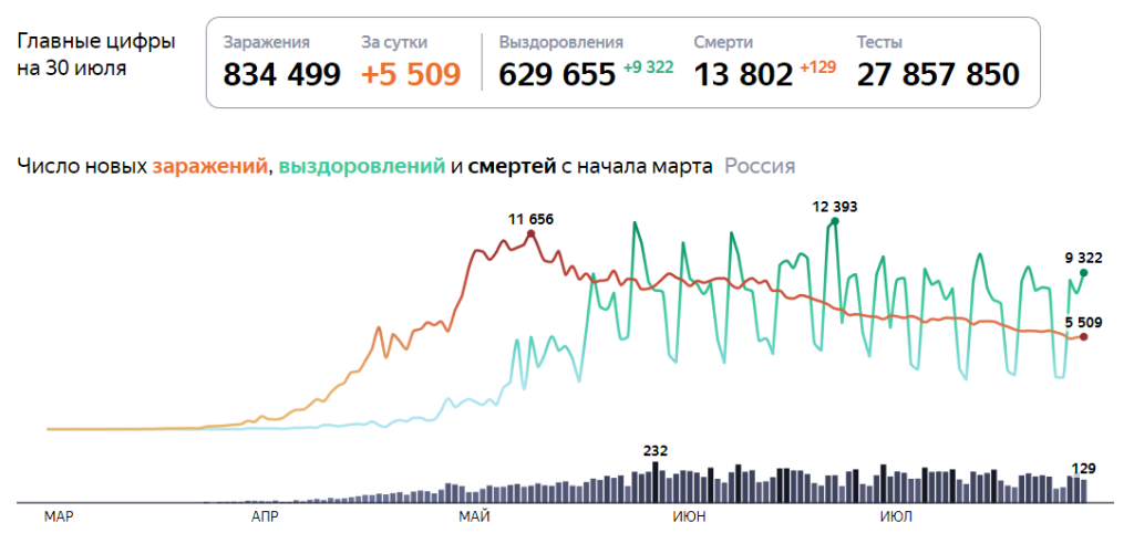 Статистика заболеваемости COVID-19 в России на 30.06.2020 г.