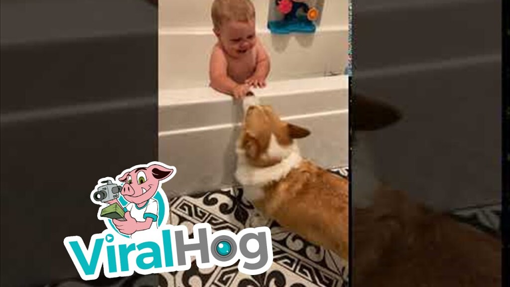 Occurred on July 23, 2020 / Pensacola, Florida, USA "Baby and corgi enjoying bath time play." Contact licensing@viralhog.com to license this or any ViralHog ...