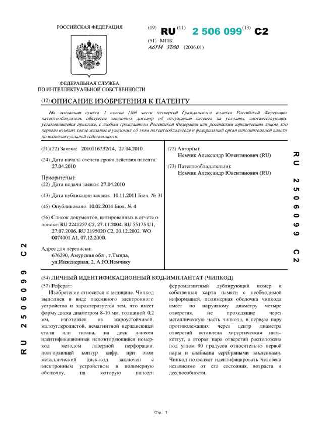 Патент RU 2 506 051 C2 на СПОСОБ ИМПЛАНТАЦИИ В ПУПОВИНУ НОВОРОЖДЕННОГО РЕБЕНКА, В ТОМ ЧИСЛЕ, ЛИЧНОГО ИДЕНТИФИКАЦИОННОГО КОДА-ИМПЛАНТАТА (ЧИПКОДА) выдан Немчик Александру Ювентиновичу, автор Немчик Ольга Васильевна. Начало действия: 2010.04.27. Я сомневаюсь, что никому не поставили до сих пор.