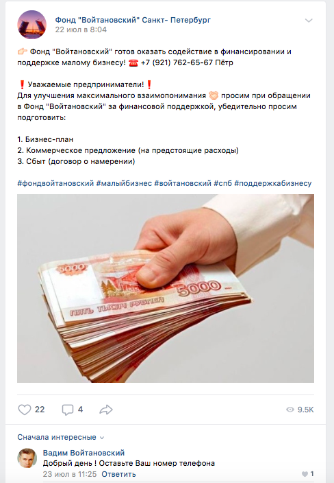 «Фонд Войтановского» (да, у него есть именной фонд) опубликовал в своих соцсетях сообщение с предложением помощи предпринимателям: вот этот пост из группы VK.