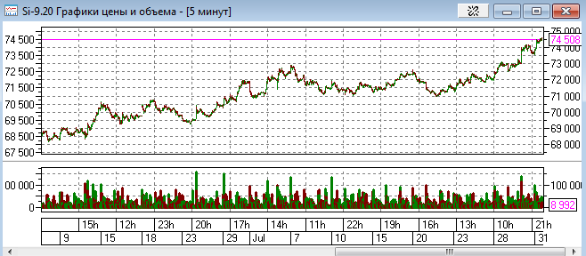 Уже падает, а рубль укрепляется (уже 74,5) - если монитор перевернуть...