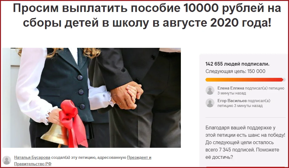 Тем временем российские родители активно подписывают петицию, размещенную на портале чандже в которой просят Президента и Правительство выплатить по 10000 рублей в августе на сборы детей в школу. Петицию подписали уже более 140 тысяч родителей.