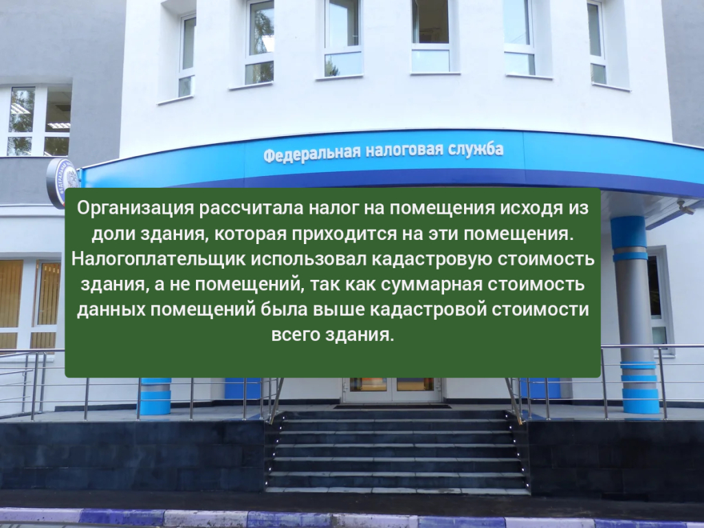 Организация рассчитала налог на помещения исходя из доли здания, которая приходится на эти помещения. Налогоплательщик использовал кадастровую стоимость здания, а не помещений, так как суммарная стоимость данных помещений была выше кадастровой стоимости всего здания.